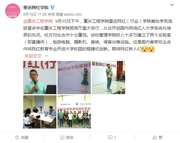 据北青报报道,有网友发帖称,重庆工程学院新开设了“网红学院”,并已经进行了“选拔学员”的工作。从该学院发布的信息来看,选拔现场人数众多,展示牌上写着“星运网红(行业)学院首批网红学员选拔会”字样。