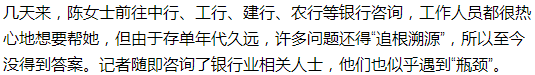 走遍银行 束手无策难取出随后,陈女士再次打听到,在湖滨南路有一家中国人民银行,便抽空前往咨询。几名工作人员得知这样的“新鲜事”,都围拢过来。他们告诉陈女士,当年的“中国人民银行”确实已经改制,不再受理存款业务,建议她到其他几家大银行咨询。“他们说很可惜,这笔钱在当年是很可观的,但是定期转活期后,根据现有利率,即使取出来也最多是2000多元。”