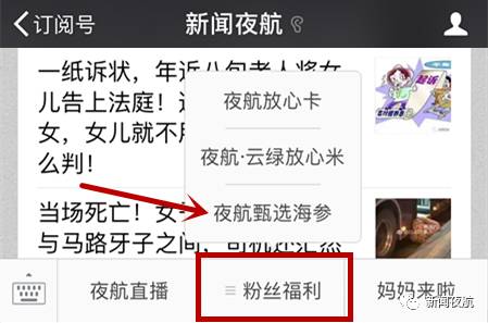 1.在《新闻夜航》公众账号下方“粉丝福利”中点击夜航甄选海参,可直接购买!