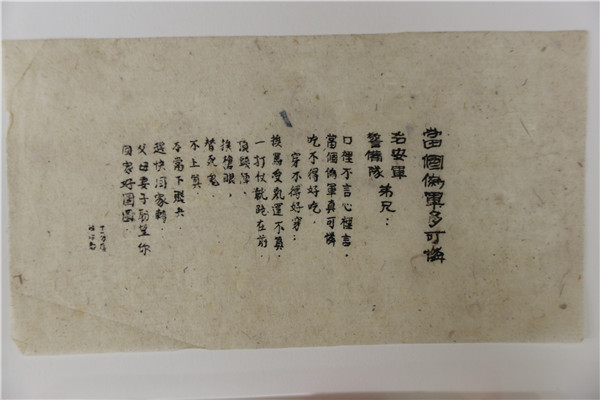 在抗日战争中,中日双方都曾通过传单打宣传战、心理战,而在绵延多年的战事中传单究竟起到怎样的宣传效果?许金生介绍:“在检验宣传效果时,有些效果是可以通过数据说明的,例如投降、倒戈人数等,但精神层面的变化及其表现,诸如宣传造成的敌军军心涣散、士气低落等心理上的表现,往往是渐现的,是无法以数据表现的。我方优待俘虏的政策,从抗战初期日军完全不知晓、不相信,到后来普遍知晓,乃至渐渐相信,便是典型之例。虽然难以比较,但可以说与看得见的效果相比,看不见的精神层面的效果肯定更大更广。”