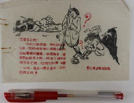 美国政治学家哈罗德·D·拉斯韦尔曾说过:“现代战争必须在三个战线展开:军事战线、经济战线、宣传战线。”在抗日战争中,除了战场上你死我活的殊死斗争之外,我方亦展开了强大的宣传战。在各种宣传方式中,传单因散发方式灵活多样、制作廉价便捷、表现形式丰富多彩,而被大量使用,甚至被誉为“纸弹”、“无声的炸弹”。