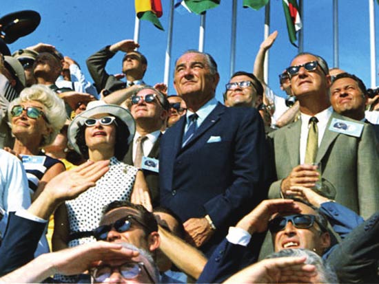 1969年7月16日,第36任美国总统林登·约翰逊(中)在肯尼迪航天中心观看“阿波罗11号”发射升空。