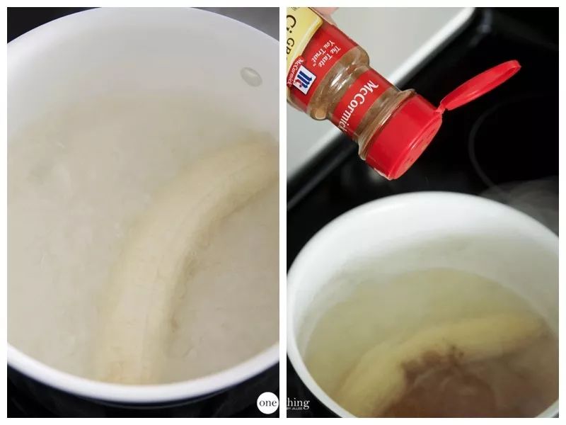把香蕉切段去皮,把果肉丢进沸水中煮十分钟左右,加入一点肉桂粉,肉桂可帮助提高身体的血糖水平,因而也有助眠的功效。