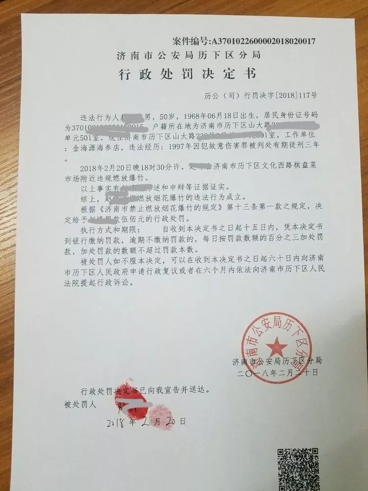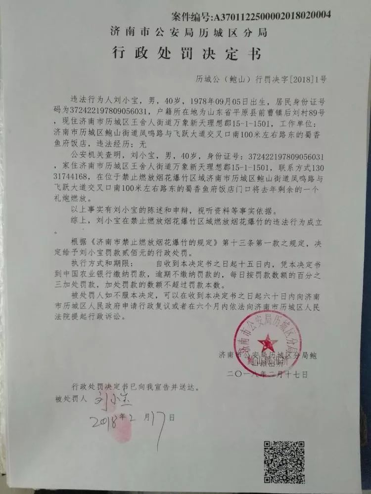 依法对刘某下达济南市公安局历城分局行政处罚决定书!