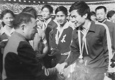 1979年9月30日,在第四届全运会闭幕式上,邓小平接见世界冠军,与孙志安握手。