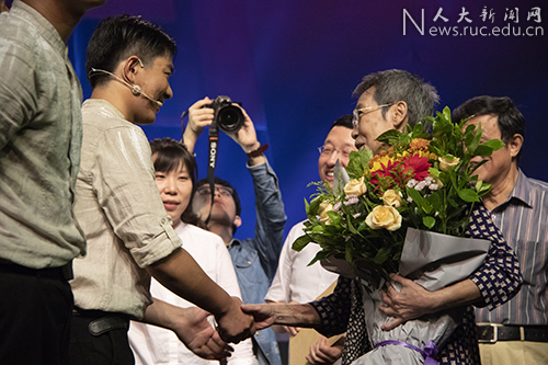 中国人民大学副校长杜鹏与来自各个学院的近千名新生一起观看了演出,并在演出开始前与吴玉章老校长的孙女、信息学院教授吴本立作了交流,共同追忆峥嵘岁月,学习先进事迹,传承革命精神。