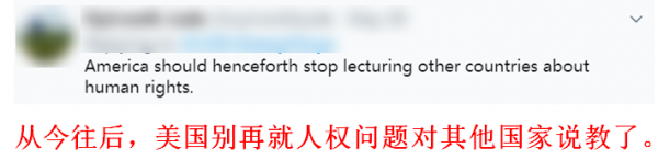 莫约的话,也道出了其他非洲国家民众的心声,美国此前经常借人权问题对非洲国家内政指手画脚,如今却在本国出现问题时表现出赤裸裸的双重标准,有非洲国家网友在美国大使馆的推特留言说,“从今往后,美国别再就人权问题对其他国家说教了”。