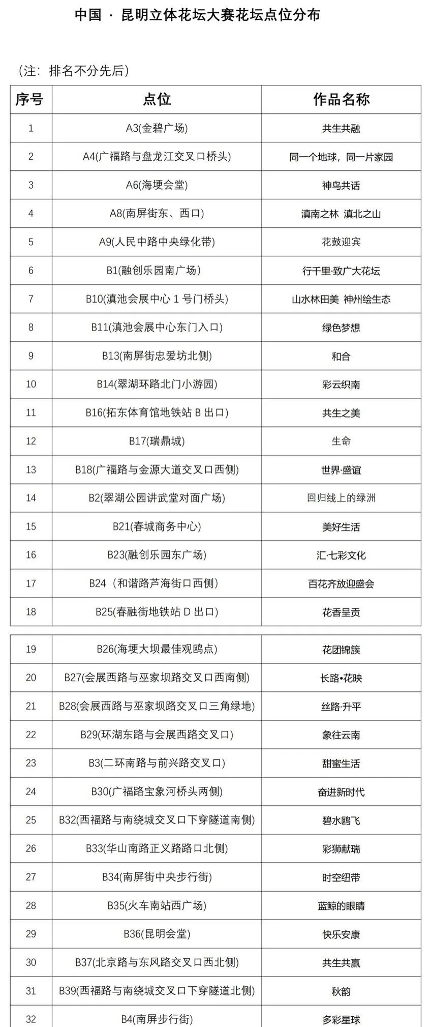 在中国风景园林学会指导下,由昆明市政府主办,中国·昆明立体花坛大赛组委会、昆明市城市管理局承办了此次“中国·昆明立体花坛大赛”。立体花坛大赛以“花融春城 共襄美好”为主题,以“城市花坛、城市艺术”为表现形式,以“关注城市品质提升,输出美好生活样本”为理念,经过专家组评审评出了100个符合要求的设计作品入围。这100个立体花坛分布于滇池国际会展中心片区、滇池海埂片区、历史文化片区、市级行政中心片区以及机场高速、滇池路、广福路、东风路、北京路、彩云路、火车南站等昆明市片区、道路和节点,展现七彩云南的生物多样性和丰富的多民族特色。