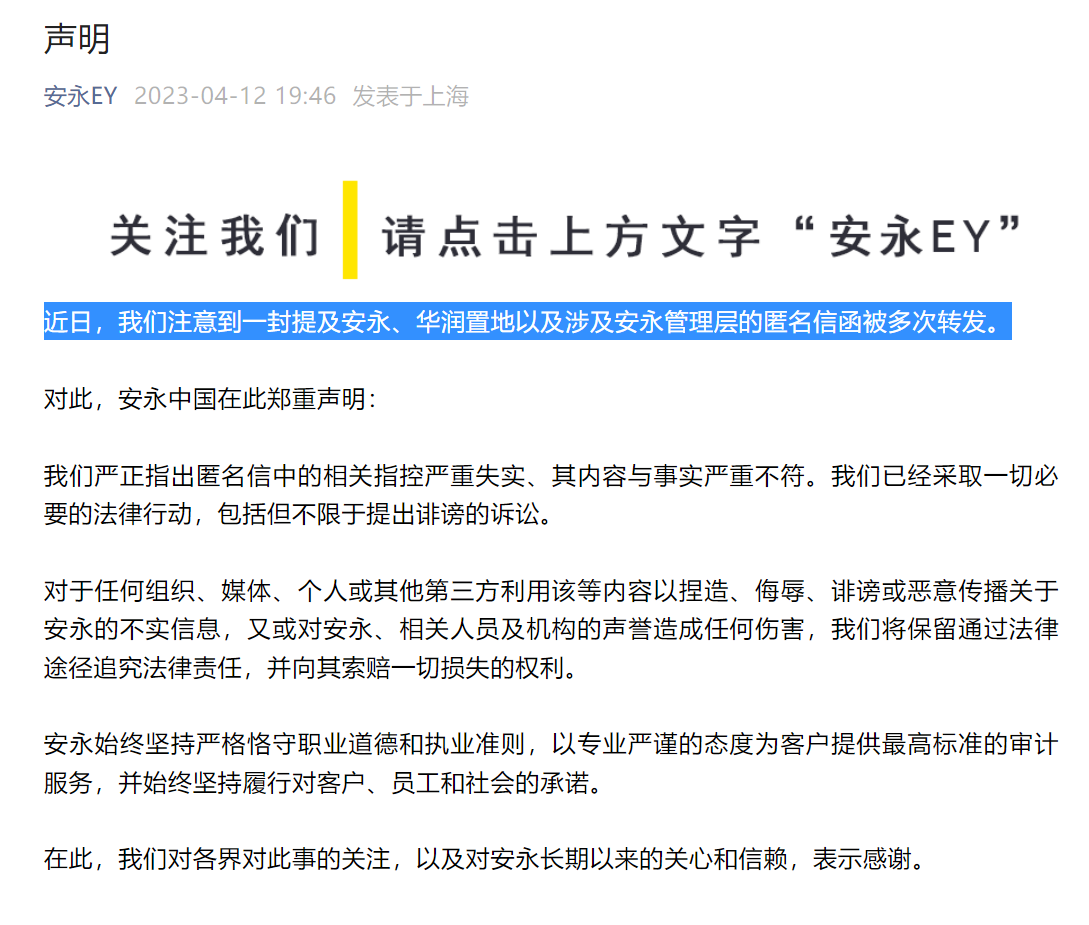 安永官方公众号“安永EY”发文称,“近日,我们注意到一封提及安永、华润置地以及涉及安永管理层的匿名信函被多次转发。”“匿名信中的相关指控严重失实、其内容与事实严重不符。我们已经采取一切必要的法律行动,包括但不限于提出诽谤的诉讼。 ”