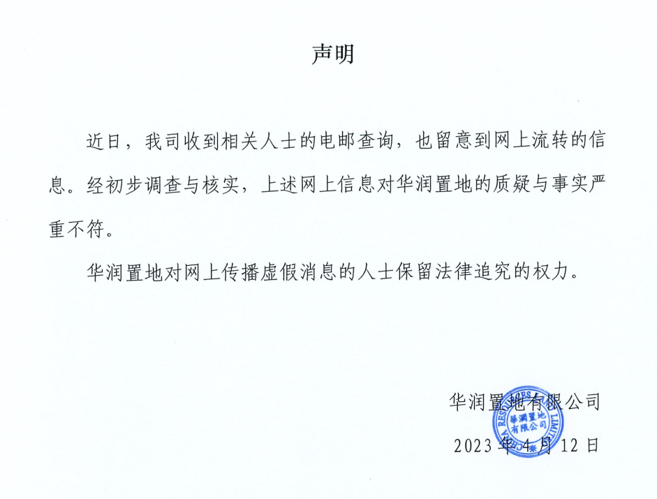 华润置地发布相关《声明》称,“近日,我司收到相关人士的电邮查询,也留意到网上流转的信息,经初步调查与核实,上述网上信息对华润置地的质疑与事实严重不符。华润置地对网上传播虚假消息的人士保留法律追究的权力。”