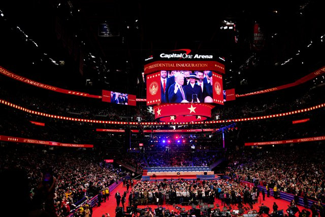 当天寒冷天气迫使这场就职典礼打破近40年惯例,首次移至圆形大厅举行。在主席台最醒目的位置,与特朗普家族并肩而坐的是在福布斯富豪榜上名列前茅的:特斯拉首席执行官马斯克、亚马逊创始人贝索斯和Meta首席执行官扎克伯格。