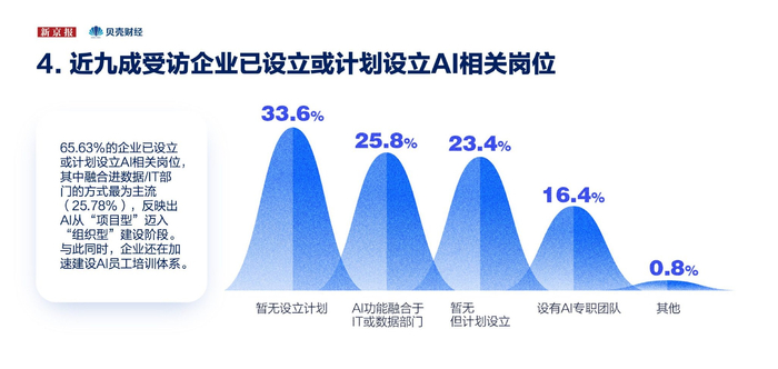 《报告》发现,65.63%的企业已设立或计划设立AI相关岗位,其中融合进数据/IT部门的方式最主流,占比25.78%,AI从“项目型”迈入“组织型”建设阶段。