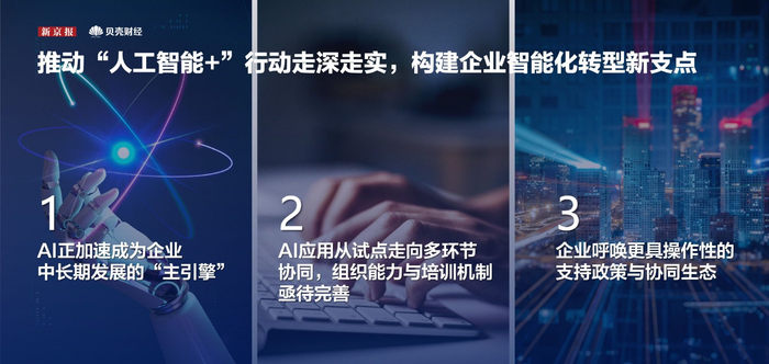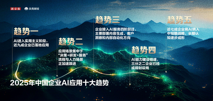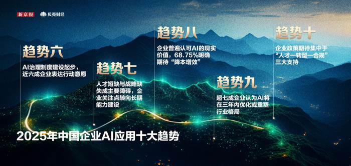 7月10日、11日、15日,2025新京报贝壳财经年会在北京和上海举行,今年的主题为“中国经济:开放与韧性共生长”。7月10日,“新京报贝壳财经年会·未来大会”上,《中国企业家人工智能应用调研报告(2025)》(以下简称《报告》)正式发布,揭晓中国企业人工智能应用的十大趋势。