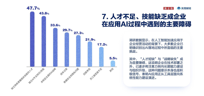 此外,尽管人工智能在企业经营中的渗透率持续上升,但其深层次应用仍受限于组织能力建设不足、治理体系滞后与转型路径模糊等结构性因素。未来,推动“人工智能+”行动走深走实,亟须在政策侧构建更具操作性的协同机制,为企业智能化转型夯实制度支撑与生态保障。