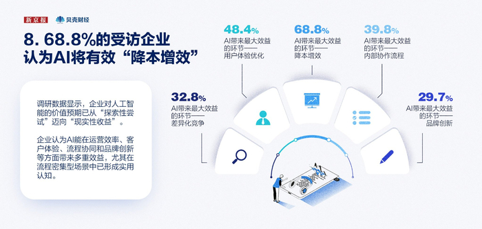调研数据显示,企业对人工智能的价值预期已从“探索性尝试”迈向“现实性收益”,68.75%的受访企业认为AI将在“降本增效”方面产生最大效益。同时,在用户体验优化、流程协同、差异化竞争等维度,AI也被企业赋予了显著的正向期待。