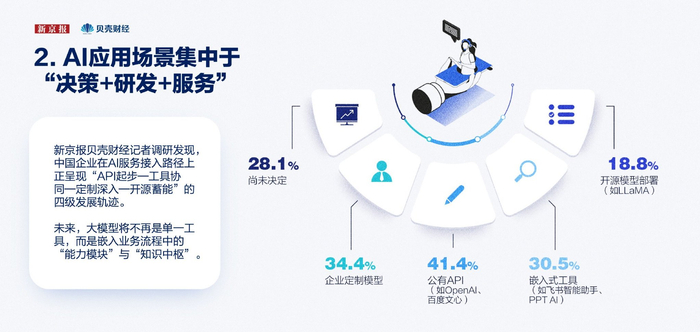 企业部署人工智能的方式正在趋于多样化。调研数据显示,受访企业当前倾向使用的AI服务类型呈现出“API为先,定制为稳,嵌入为辅,开源为远”的格局。
