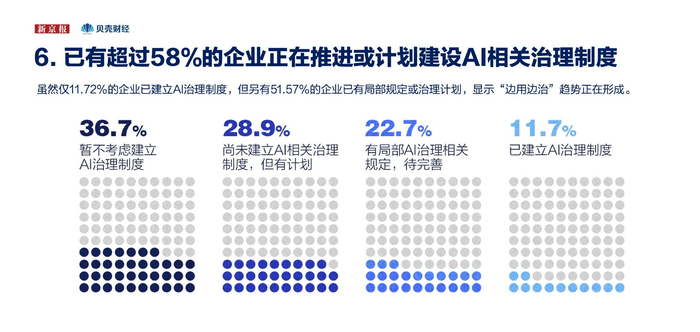 调研显示,11.72%的受访企业已建立AI治理制度,另有51.57%的企业已有局部规定或治理计划。企业的AI治理制度建设仍处于起步阶段,但已有近六成企业表达出相应的行动意愿,“边用边治”趋势正在形成。