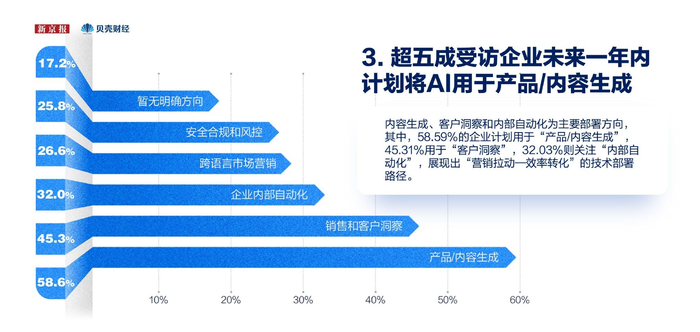 41.41%的受访企业首选公有API接入,34.38%配置定制化模型,30.47%使用嵌入式工具。内容生成、客户洞察和内部自动化为主要部署方向,其中,58.59%的企业计划用于“产品/内容生成”,45.31%用于“客户洞察”,32.03%则关注“内部自动化”,展现出“营销拉动-效率转化”的技术部署路径。