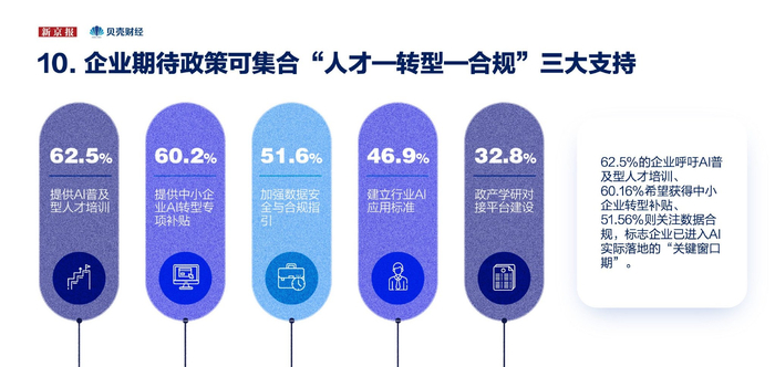 随着企业对人工智能应用的深入推进,配套支持政策的诉求也趋于集中、明确。62.5%的受访企业呼吁AI普及型人才培训,60.16%希望获得中小企业转型补贴,51.56%关注数据合规,企业已进入AI实际落地的“关键窗口期”。