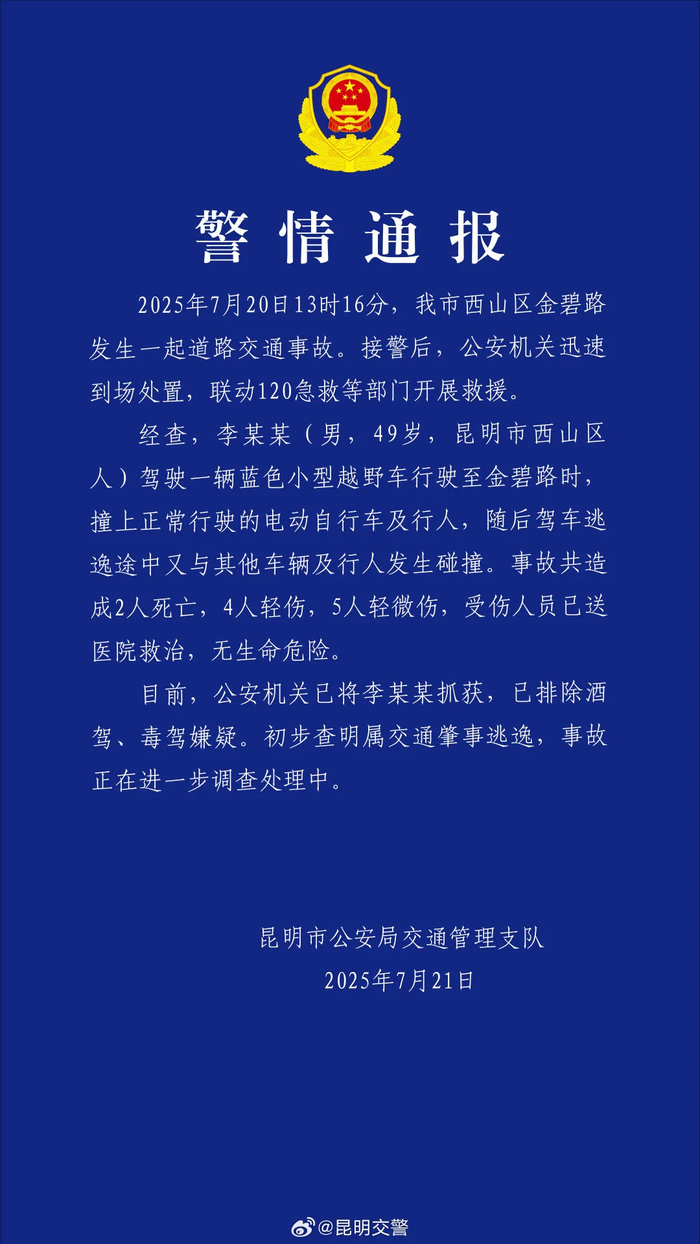 20日13时16分,云南省昆明市西山区金碧路发生一起道路交通事故。经查,李某某(男,49岁,昆明市西山区人)驾驶一辆蓝色小型越野车行驶至金碧路时,撞上正常行驶的电动自行车及行人,随后驾车逃逸途中又与其他车辆及行人发生碰撞。事故共造成2人死亡,4人轻伤,5人轻微伤,受伤人员已送医院救治,无生命危险。