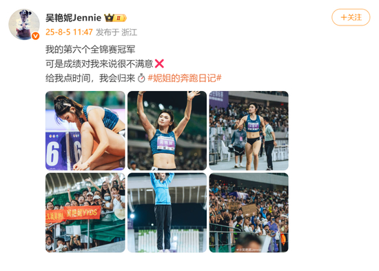8月5日,吴艳妮发文回应“13秒15夺得全锦赛冠军”:我的第六个全锦赛冠军,可是成绩对我来说很不满意,给我点时间,我会归来。