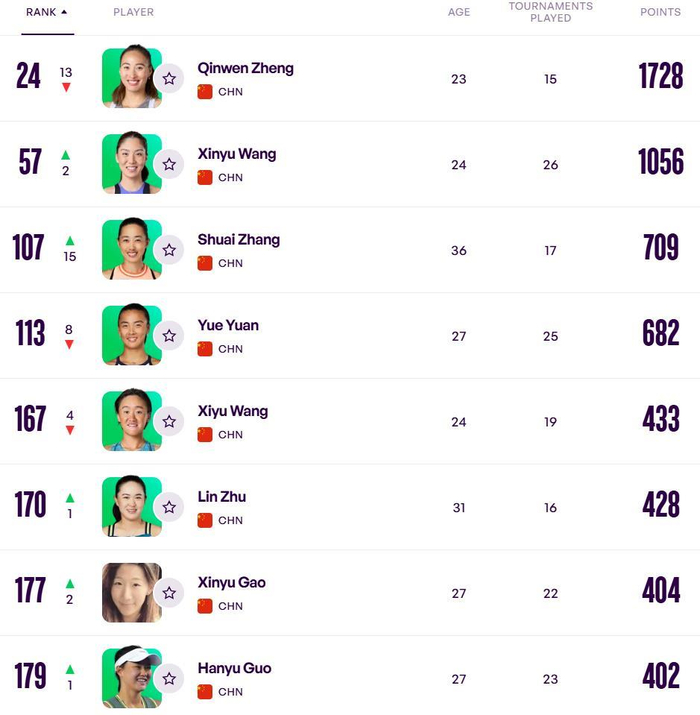 由于肘伤尚未康复,仍处于休赛状态的郑钦文,最近要扣除去年东京站冠军的500积分,排名下滑至第24位。