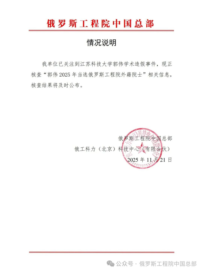 俄罗斯工程院中国总部微信公号11月21日发布情况说明: