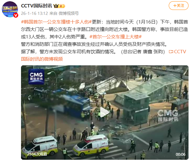 据CCTV国际时讯消息,当地时间今天(1月16日)下午,韩国首尔西大门区一辆公交车在十字路口附近撞向附近大楼。韩国警方称,事故目前已造成13人受伤,其中2人伤势严重。