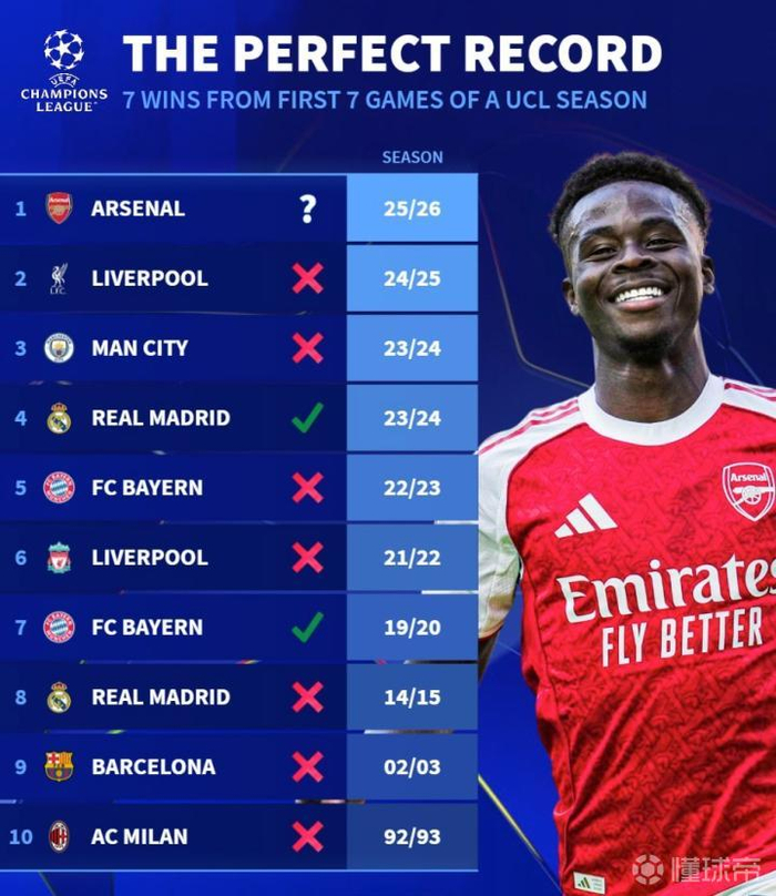 根据德转的统计,在阿森纳之前欧冠历史上曾有9支球队达成过开季至少7连胜的成就,但其中只有19-20赛季的拜仁以及23-24赛季的皇马拿到了最后的冠军,其余的7支球队包括92-93赛季的米兰、02-03赛季的巴萨、14-15赛季的皇马、21-22赛季的利物浦、22-23赛季的拜仁、23-24赛季的曼城以及24-25赛季的利物浦全部与冠军无缘。