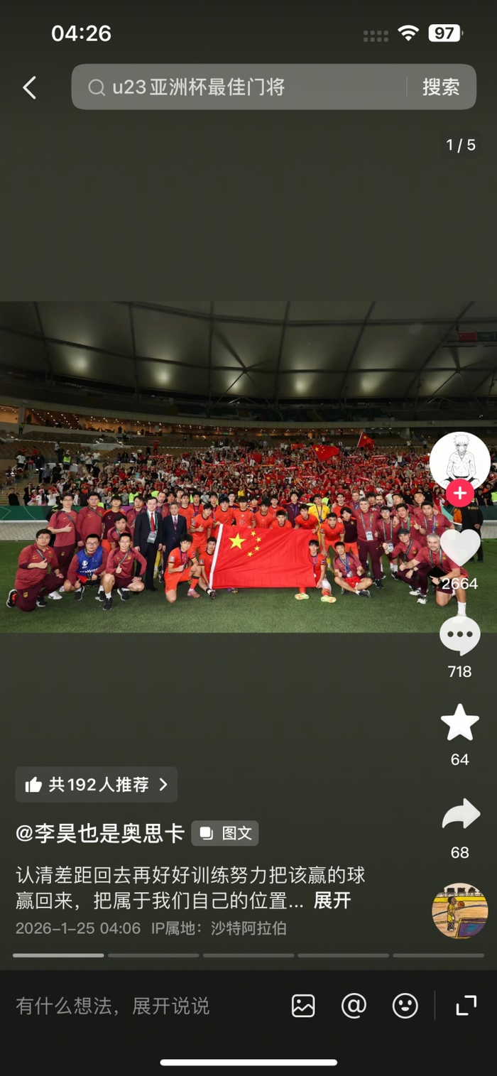直播吧01月25日讯 U23亚洲杯决赛,国足0-4不敌日本无缘冠军,赛后国足U23门将李昊更新社媒。