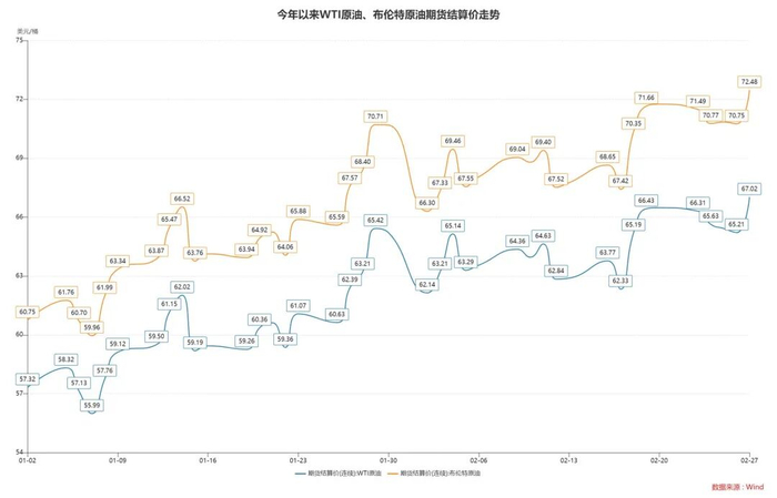 当前,中东局势急转直下,市场对原油供应面临直接威胁的担忧持续升温,此次地缘冲突会否冲击国际油价、进而影响全球通胀预期,仍有待进一步观察。截至2月27日收盘,国际油价也率先出现异动:美国WTI原油期货价格收于每桶67美元,涨幅达2.8%;4月交货的伦敦布伦特原油期货价格收于每桶72.48美元,涨幅为2.45%。