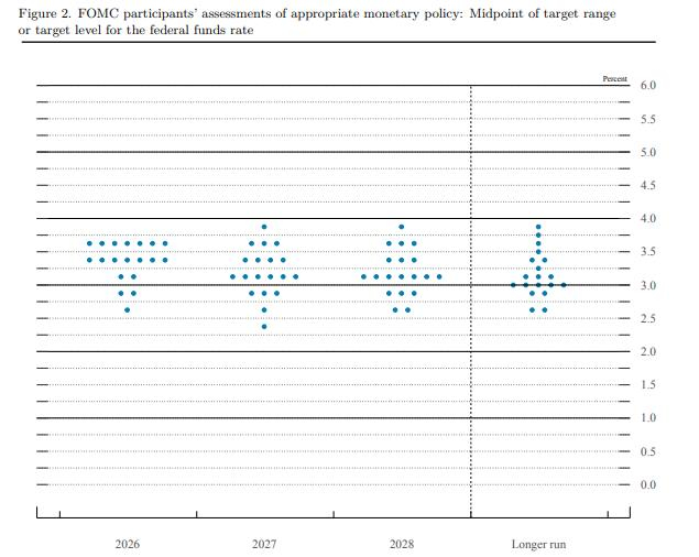 更新版点阵图显示,美联储内部分歧依然巨大。19位与会者中,预计今年降息1次或按兵不动的各有7位,外界预测,有1位主张2026年激进降息100个基点的委员可能依然是米兰。2027年和2028年热门区间为3.00%-3.25%,分别有6位委员和7位委员赞成,但整体分别依然分散,与去年12月类似。