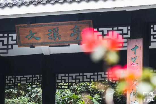 旁边还有一座黒褐琉璃瓦顶的凉亭,亭旁绿树掩映,流水淳淳,角落里绽放着艳丽的三角梅。