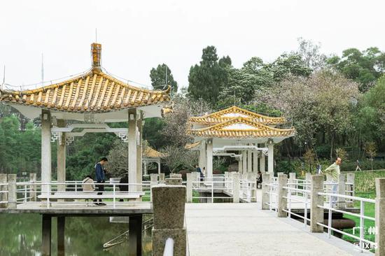 园内林木苍翠,鸟语花香,亭榭桥廊点缀其中,是一片城市中的绿洲。