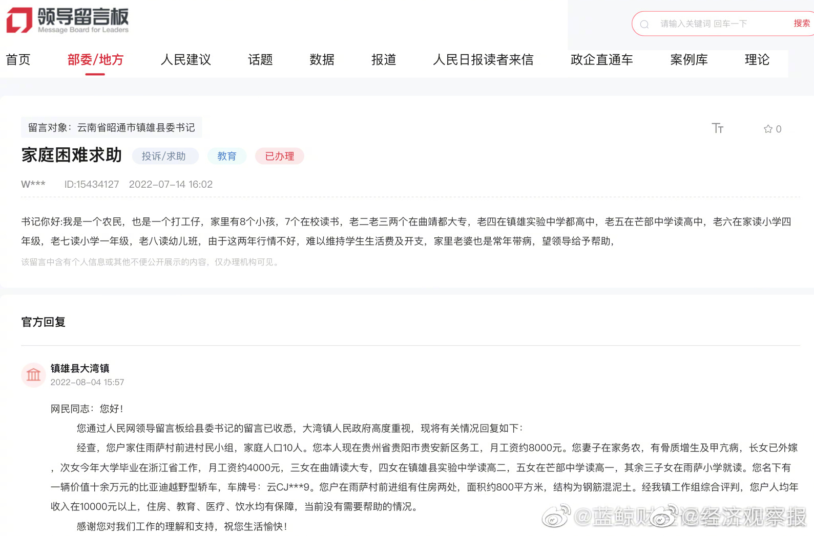 对此,8月4日,镇雄县大湾镇官方回复: 经查,您户家住雨萨村前进村民小组,家庭人口10人。您本人现在贵州省贵阳市贵安新区务工,月工资约8000元。您妻子在家务农,有骨质增生及甲亢病,长女已外嫁,次女今年大学毕业在浙江省工作,月工资约4000元,三女在曲靖读大专,四女在镇雄县实验中学读高二,五女在芒部中学读高一,其余三子女在雨萨小学就读。您名下有一辆价值十余万元的比亚迪越野型轿车,车牌号:云CJ***9。您户在雨萨村前进组有住房两处,面积约800平方米,结构为钢筋混泥土。经我镇工作组综合评判,您户人均年收入在10000元以上,住房、教育、医疗、饮水均有保障,当前没有需要帮助的情况。