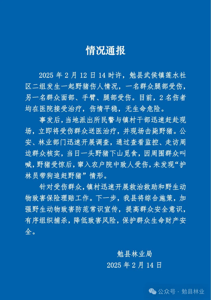 2月14日,勉县林业局发布情况通报称,2025年2月12日14时许,勉县武侯镇莲水社区二组发生一起野猪伤人情况,一名群众腿部受伤,另一名群众面部、手臂、腿部受伤。目前,2名伤者均在医院接受治疗,伤情平稳,无生命危险。