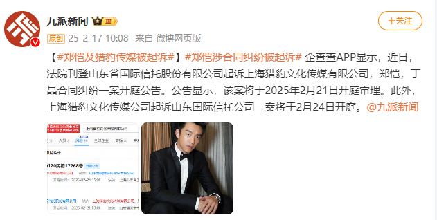 [郑恺及猎豹传媒被起诉]企查查APP显示,近日,法院刊登山东省国际信托股份有限公司起诉上海猎豹文化传媒有限公司,郑恺,丁晶合同纠纷一案开庭公告。公告显示,该案将于2025年2月21日开庭审理。此外,上海猎豹文化传媒公司起诉山东国际信托公司一案将于2月24日开庭。