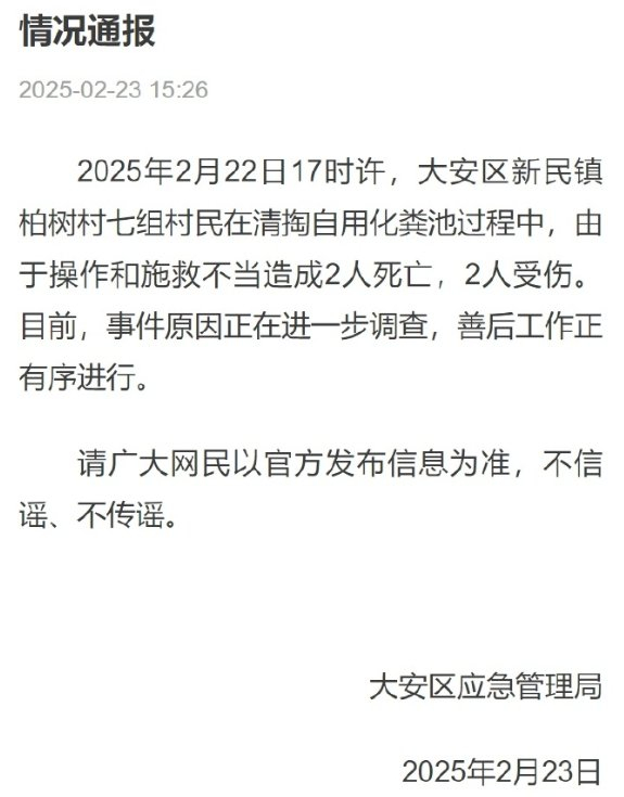 央视网消息:据大安观察客户端消息,四川自贡大安区应急管理局通报,2月22日17时许,大安区新民镇柏树村七组村民在清掏自用化粪池过程中,由于操作和施救不当造成2人死亡,2人受伤。目前,事件原因正在进一步调查,善后工作正有序进行。请广大网民以官方发布信息为准,不信谣、不传谣。