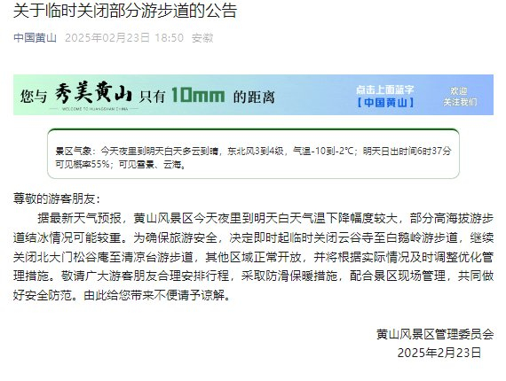 央视网消息:2月23日,黄山风景区管理委员会发布公告,据最新天气预报,黄山风景区今天夜里到明天白天气温下降幅度较大,部分高海拔游步道结冰情况可能较重。为确保旅游安全,决定即时起临时关闭云谷寺至白鹅岭游步道,继续关闭北大门松谷庵至清凉台游步道,其他区域正常开放,并将根据实际情况及时调整优化管理措施。敬请广大游客朋友合理安排行程,采取防滑保暖措施,配合景区现场管理,共同做好安全防范。