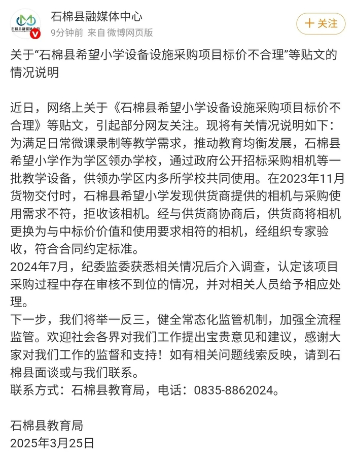 ·希望小学14050元买相机只值631元?石棉县教育局通报。