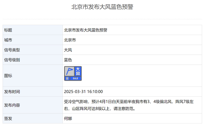 央视网消息:据北京市气象局网站消息,受冷空气影响,预计4月1日白天至前半夜北京市有3、4级偏北风,阵风7级左右,山区阵风可达8级以上,请注意防范。
