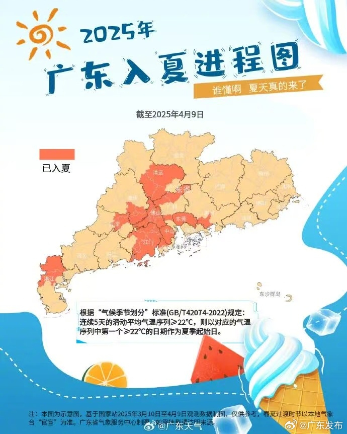 央视网消息:据广东省人民政府新闻办公室官方微博消息,据气象部门统计,目前清远、佛山、东莞、中山、江门等多个地市正在入夏的进程上,不少地市已达到入夏标准,只等“官宣”。相比去年,大部分地市入夏时间更晚一些。