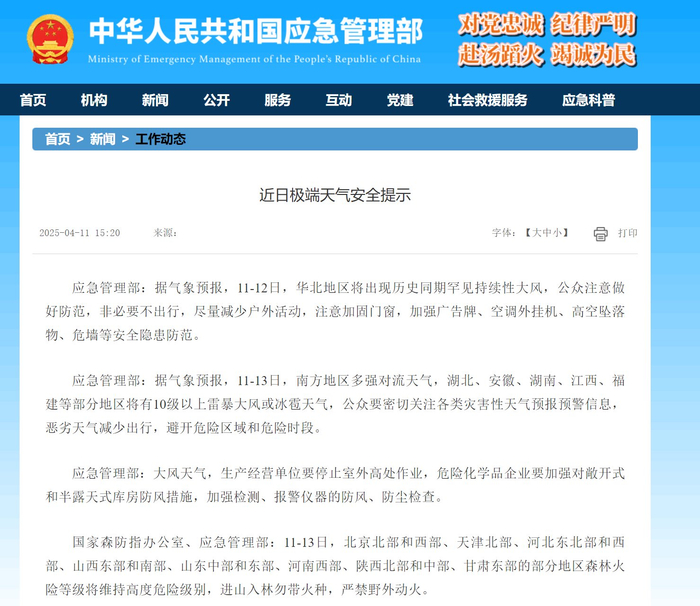 应急管理部:据气象预报,11-12日,华北地区将出现历史同期罕见持续性大风,公众注意做好防范,非必要不出行,尽量减少户外活动,注意加固门窗,加强广告牌、空调外挂机、高空坠落物、危墙等安全隐患防范。