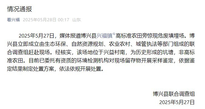 央视网消息:山东滨州市博兴县联合调查组通报,5月27日,媒体报道博兴县兴福镇高标准农田旁惊现危废填埋场。博兴县立即成立由生态环保、自然资源规划、农业农村、城管执法等部门组成的联合调查组赶赴现场。经核实,该场地位于兴益村南,为历史形成的坑塘,非高标准农田。目前已委托有资质的环境检测机构对现场留存物开展采样鉴定,依据鉴定结果制定处置方案,依法依规开展处置。