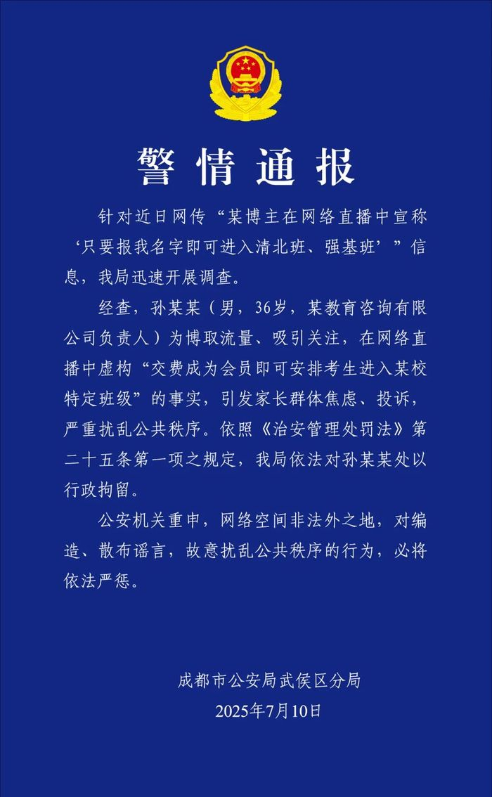 央视网消息:据“成都武侯公安”微信公众号消息,成都市公安局武侯区分局7月10日发布警情通报:针对近日网传“某博主在网络直播中宣称‘只要报我名字即可进入清北班、强基班’”信息,成都市公安局武侯区分局迅速开展调查。