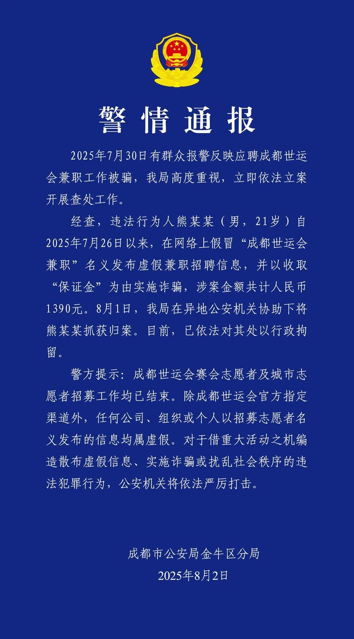 经查,违法行为人熊某某(男,21岁)自7月26日以来,在网络上假冒“成都世运会兼职”名义发布虚假兼职招聘信息,并以收取“保证金”为由实施诈骗,涉案金额共计人民币1390元。8月1日,我局在异地公安机关协助下将熊某某抓获归案。目前,已依法对其处以行政拘留。