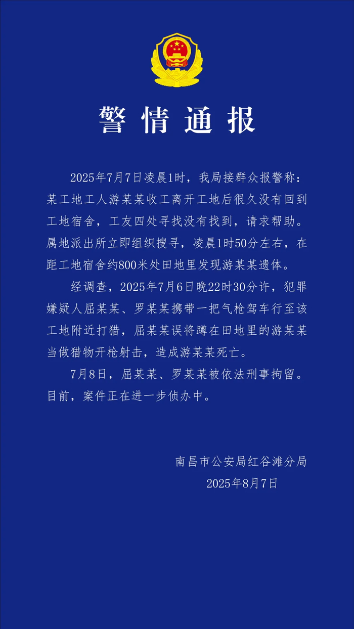 ·南昌警方通报:两人打猎误将他人当做猎物射击致死,已被刑拘。