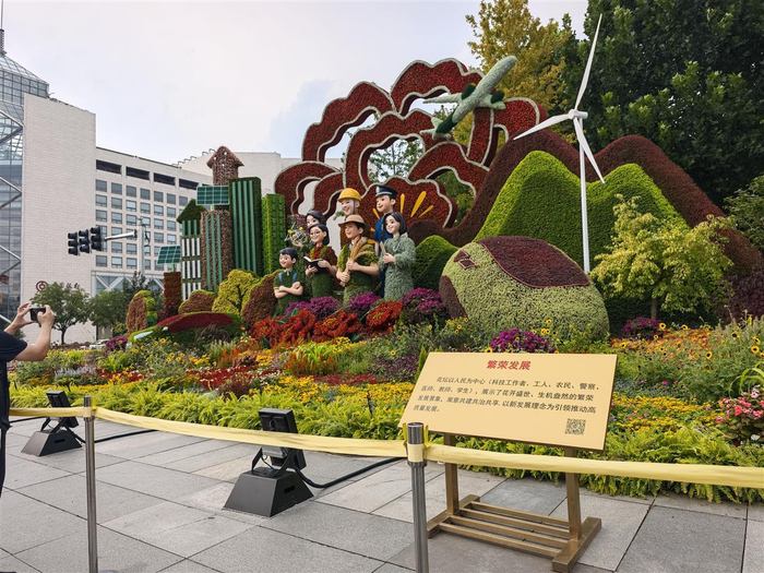 其中,“繁荣发展”主题花坛以人民为中心(科技工作者、工人、农民、警察、医师、教师、学生),展示了花开盛世、生机盎然的繁荣发展景象。