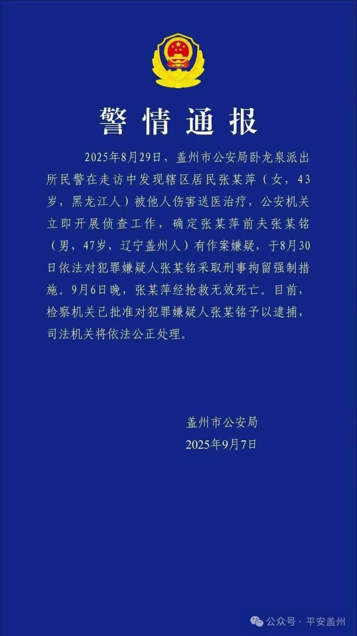 ·盖州警方通报“男子殴打前妻致其死亡”:犯罪嫌疑人已被逮捕。