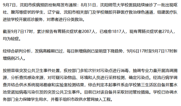 ·辽宁沈阳通报一学校自备井蓄水池受诺如病毒污染事件。
